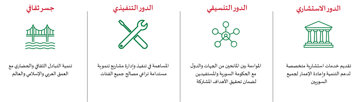 To be an enabler of Syria's Recovery, a catalyst for developmental investments, and a strategic consulting and implementation partner for stakeholders involved in reconstruction and sustainable development in the Syria of the future.