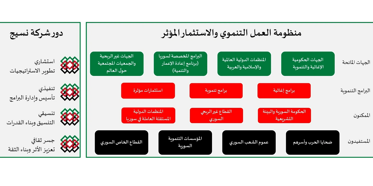 Naseej is strategically positioned as a supporter and enabler of the system by providing consulting, management, and executive services to donors to enhance the effectiveness of the development system. This is achieved through conducting studies, developing strategies, supporting decision-making for donors, establishing grant frameworks through various structures, and managing development programs. Additionally, Naseej works to improve the efficiency of development enablers and maximize the impact for beneficiaries.